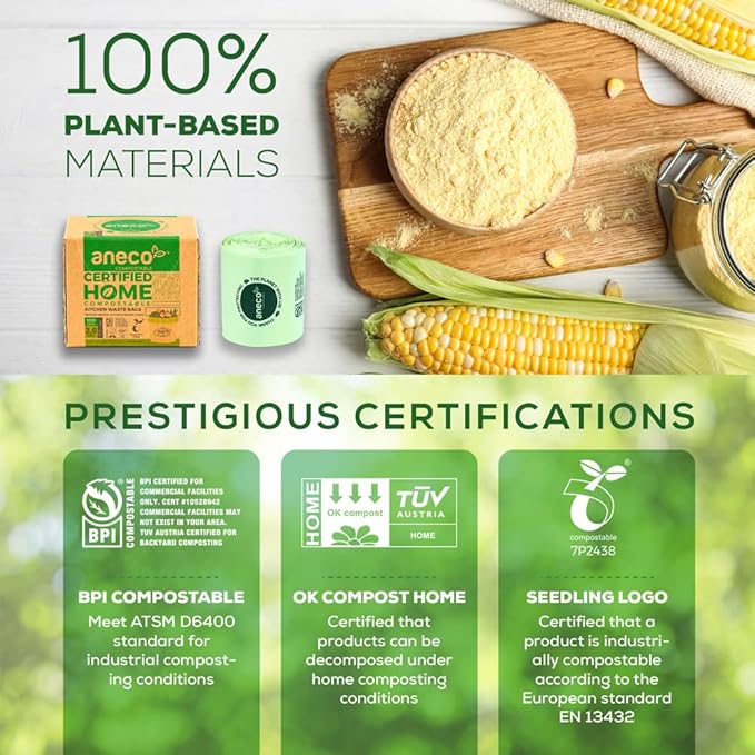 - 🍀 Proud to be one of few HOME compostable trash bags in the market, ANECO Compostable bag can break down completely not only in industrial facilities but also in home system. Use these bags to collect kitchen scraps and put them straight into the compost dumpster, or bury and turn them into valuable compost for your gardendecomposes fully into CO2, water and organic biomass after 6-12 months, leaving no traces of plastic in the environment.