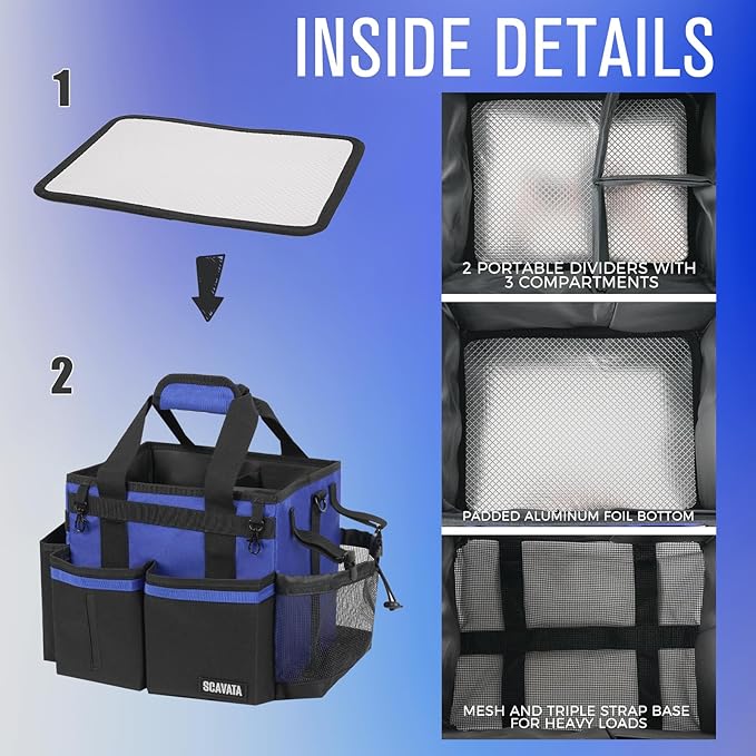 - Customizable Internal Layout: The wearable cleaning caddy bag comes with 2 adjustable dividers, allowing you to arrange the inner compartments to fit various cleaning tools and supplies. The aluminum foil pad on the bottom keeps contents dry and fresh by preventing moisture, grime, and unpleasant odors from affecting stored items.