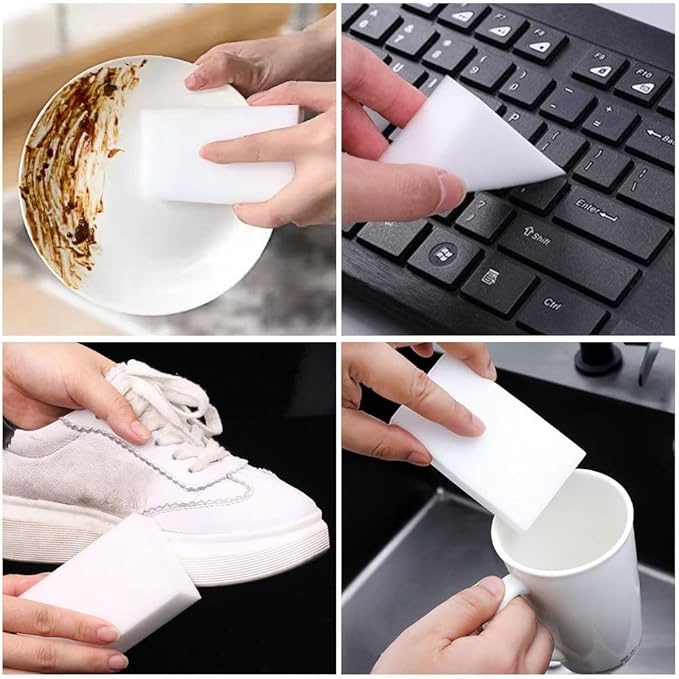 - MULTIFUNCTIONAL CLEANER: Our unique sponge can easily remove grease, dirt and dust from kitchen utensils, such as blenders, coffee machines, toasters, storage containers, clean glass, leather products, shoes, car interiors, office supplies , Floors, tiles, etc.Please note:Don't scrub hard.Do not rub the skin, so as not to damage the skin.Do not use it on shiny polished surfaces such as cars, PC screens, etc