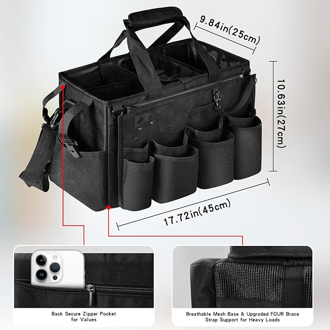 - 【Sturdy and spacious】This oversized sturdy cleaning caddy bag is made of sturdy polyester and lined with wipeable waterproof polyester. The bottom is sturdy and the bag itself is of high quality and can be used for many years. Easy to clean and use. The size is 17.7x 10.2 x 9.1 inches.